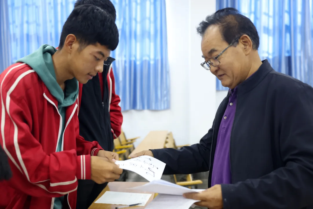 课堂休息期间,陈宝轩将自己创作的书法作品一一分发给学生们,现场掌声阵阵。这些作品不仅是艺术展示,更是对学生们学习书法的鼓励与期许。