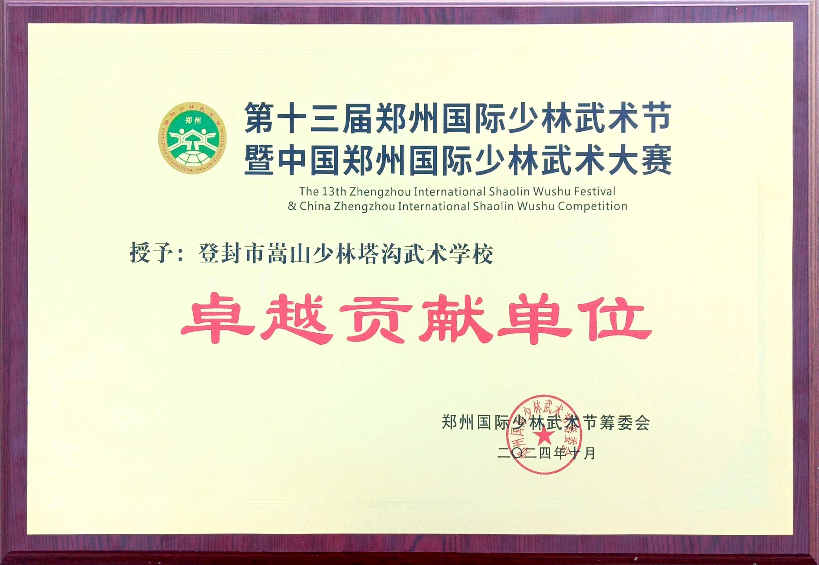 登封市嵩山少林塔沟武术学校卓越贡献单位