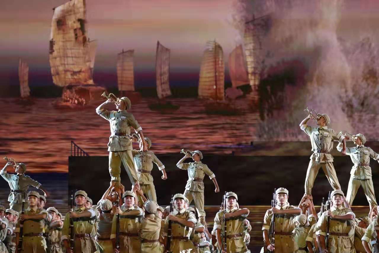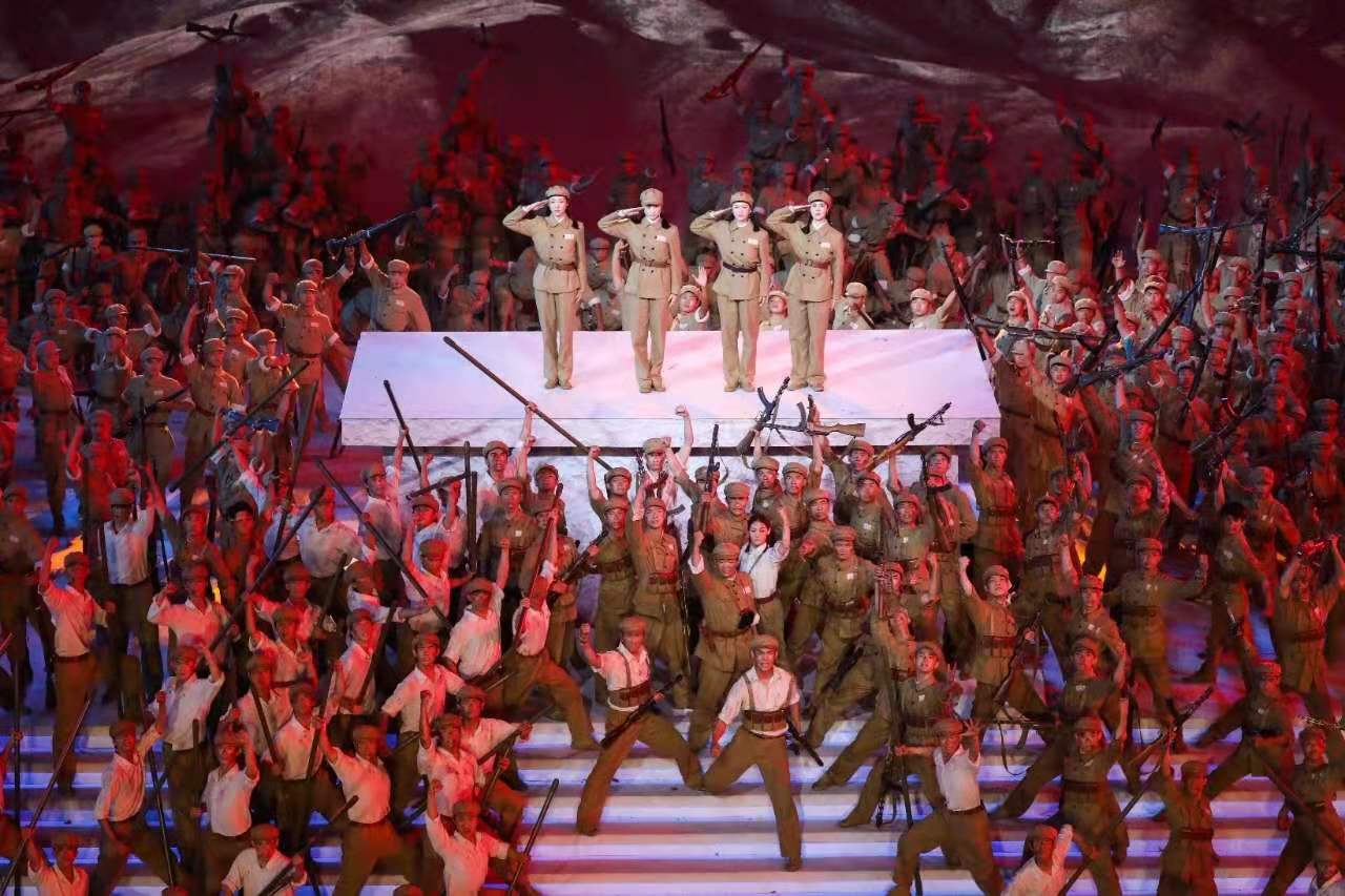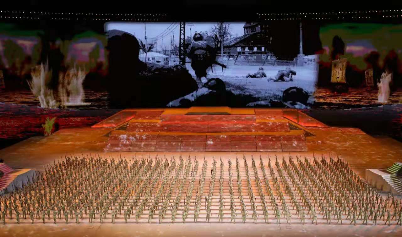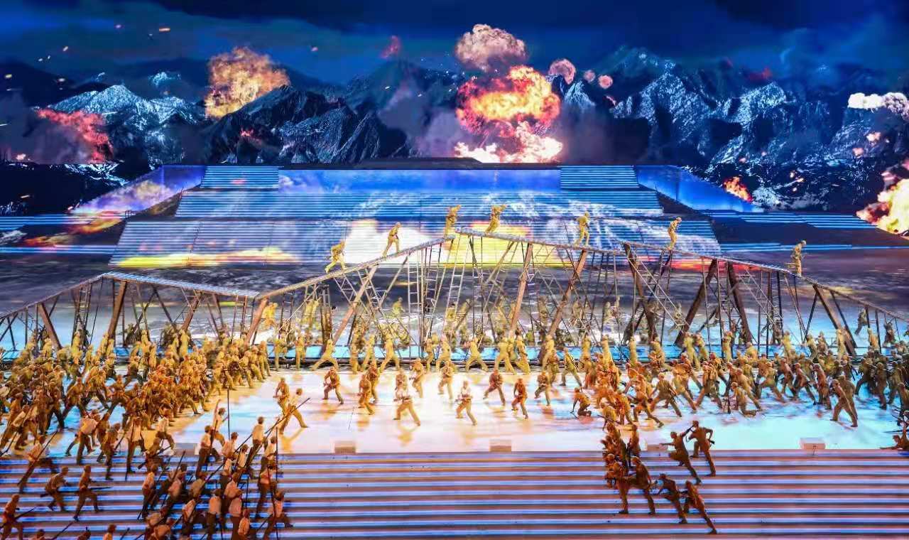 “妈妈,请放心,有儿子在,绝不允许敌人跨过我们的阵地,因为我的身后,有您和新中国”!第二篇章《战旗美如画》节目开始后,塔沟武校1200名学员在六分多钟时间里,情景再现了抗美援朝的激战场面,学员们饰演的中国人民志愿军,在搭建的木桥上冒着连天炮火快速通过,一批又一批战士在冲锋中倒下,生动展现了中国人民志愿军不怕牺牲、顽强战斗和视死如归精神。