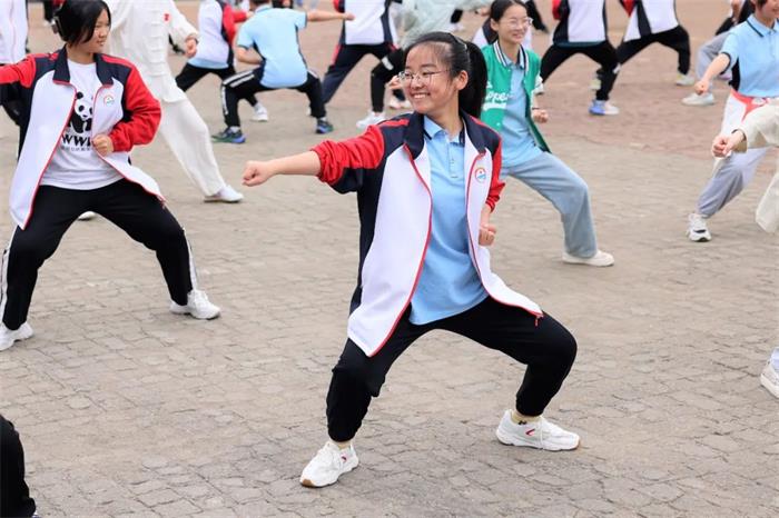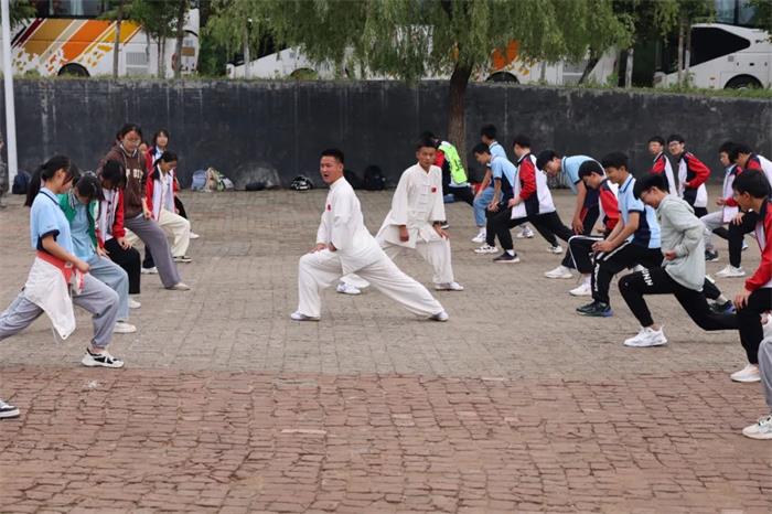 演出结束后,研学游学员跟随塔沟武校专业队学生体验少林连环拳,经过刚才精彩的武术表演,学员们个个劲头十足。经过短时间的学习,部分学员已经可以做出一套基本动作。