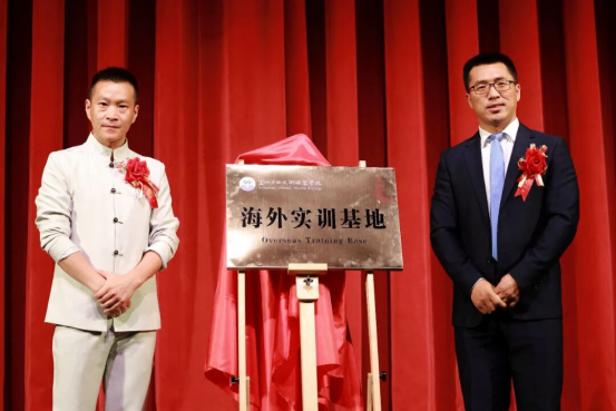 学院国际部主任赵君明(右)与美国龙韵少林功夫学院院长袁龙共同为海外实训基地揭牌