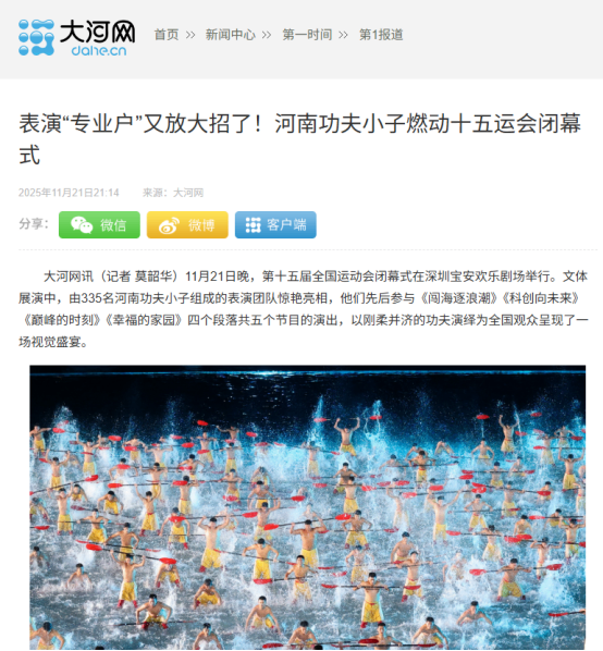 大河网讯(记者 莫韶华)11月21日晚,第十五届全国运动会闭幕式在深圳宝安欢乐剧场举行。文体展演中,由335名河南功夫小子组成的表演团队惊艳亮相,他们先后参与《闯海逐浪潮》《科创向未来》《巅峰的时刻》《幸福的家园》四个段落共五个节目的演出,以刚柔并济的功夫演绎为全国观众呈现了一场视觉盛宴。