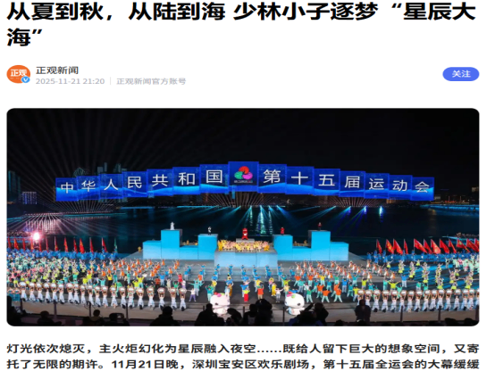 灯光依次熄灭,主火炬幻化为星辰融入夜空……既给人留下巨大的想象空间,又寄托了无限的期许。11月21日晚,深圳宝安区欢乐剧场,第十五届全运会的大幕缓缓落下。作为全运会历史上首次在开放滨海实景舞台上进行的闭幕式,当晚的演出创下了多项“之最”,演出圆满完成的那一刻,300多名来自河南登封塔沟教育集团的演员们面朝大海,仰望星空,携手共庆他们演艺生涯中的又一次重要成就。“让少林功夫在大湾区得到更好的绽放!”从盛夏到深秋,从内陆到海滨,辗转两地、数月排练,小伙子们如约实现了自己的诺言。