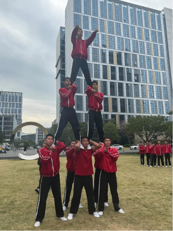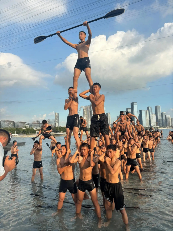 在学校的排练早在7月中旬就开始了,起初没有船桨,演员们就在平时练功用的少林棍上套一个塑料瓶,来模仿划桨的动作。因为实际演出中龙舟这个节目是在水中,所以塔沟武校专门在校内搭建了一个40米X40米的泳池,进行实景训练。节目中要搭建起三层人塔,这原本是在武术团体操表演中常见的操作,但要在水里表演,难度就大大增加。“都是光着上身穿着泳裤下水,下面的人身上湿透了,上面的人踩上去就容易打滑,另外,光着脚踩到赤裸的肩膀上,和穿着鞋隔着衣服踩上去感觉完全不一样,必须脚心踩到肩膀,脚掌不能踏着锁骨,不然下面的人容易受伤。”表演团领队徐向天介绍,“就这么一点点摸索,慢慢地达到了导演组的要求。”