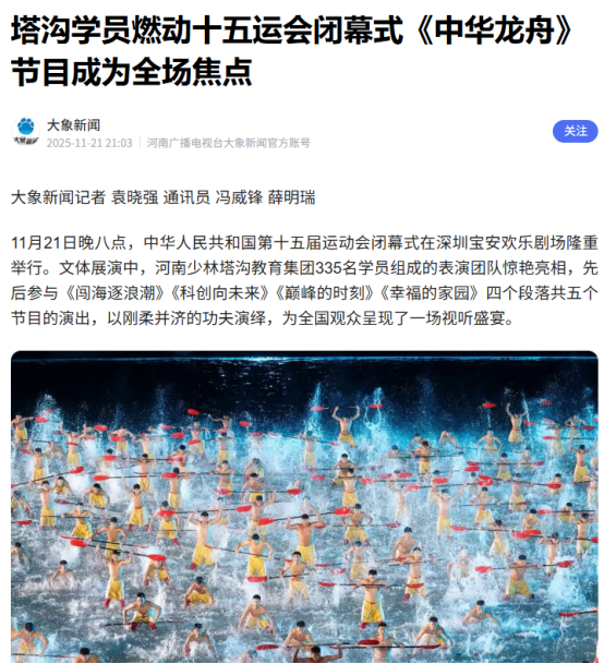 11月21日晚八点,中华人民共和国第十五届运动会闭幕式在深圳宝安欢乐剧场隆重举行。文体展演中,河南少林塔沟教育集团335名学员组成的表演团队惊艳亮相,先后参与《闯海逐浪潮》《科创向未来》《巅峰的时刻》《幸福的家园》四个段落共五个节目的演出,以刚柔并济的功夫演绎,为全国观众呈现了一场视听盛宴。