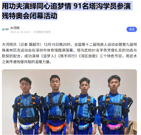 塔沟武校学员的精彩表现,不仅展现了中国武术的独特魅力,更以实际行动诠释了残健共融的美好理念,为本次残特奥会增添了浓墨重彩的一笔。