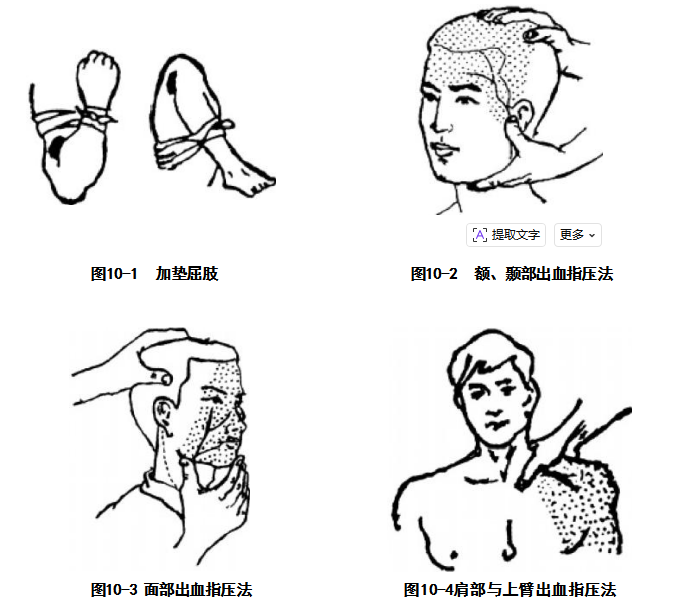 抬高伤肢法:将肢体抬高,使出血部位高于心脏,从而使出血部位的血压降低,减少 出血。此法仅适用于四肢毛细血管及小静脉出血。
