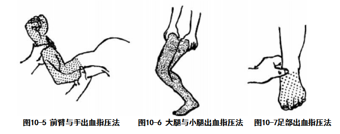 前臂和手掌出血时,使患肢外展,用四指压迫上臂内侧(图10-5)。手指出血时,可 压迫指动脉。压迫点在第一指节根部两侧,用拇指和食指相对夹压。大腿和小腿出血时, 可压迫股动脉。压迫点在腹股沟皱纹中点搏动处,用手掌或拳向下方的股骨面压迫(图1-46)