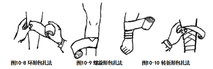 环形包扎法:多用于包扎肢体粗细均匀的部位,如额部、手腕、小腿下部。包扎时把 带头斜放,用手压住,将卷带绕肢体包扎一圈后,再将带头的一个小角反折过来,然后继 续绕圈包扎,后一圈盖住前一圈,包扎3至4圈即可(图10-8)。
