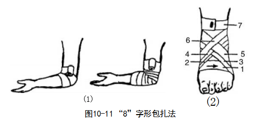 “8”字形包扎法:用于关节部位的包扎,包扎法有两种。 一种是从关节部位开始,先 做环形包扎法,然后将圈带斜行缠绕, 一圈在关节上方缠绕, 一圈在关节下方缠绕,两圈 在关节凹面交叉,反复进行,逐渐离开关节,每圈压住前一圈的1/2至1/3,最后在关节 的上方或下方以环形包扎法结束。另一种是从关节下方开始,先做环形包扎法,然后由下 而上、由上而下地来回做“8”字形缠绕关节,最后以环形包扎法结束(图10-11)。