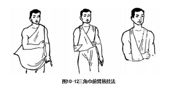 前臂骨折固定法:在伤员前臂的掌背侧各放一块夹板,用三角巾宽带绑扎固定后以大 悬臂带悬挂胸前(图10-15)。