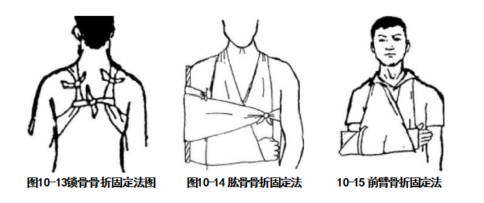 肱骨骨折固定法:取一合适夹板,放于伤肢外侧,再用两条绷带固定骨折的上、下两 端,然后用小悬臂带将前臂吊起,最后用三角巾把伤肢绑在躯干上加以固定(图10-14)。