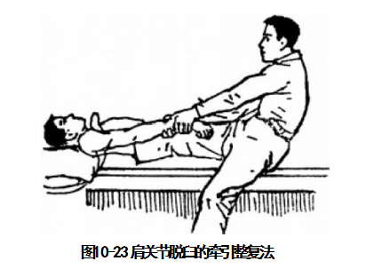 4.肩关节脱位的复位法:在肩关节急性脱位半小时内,由于患处反射性的神经传导 阻滞处于麻木状态,不需麻醉就可复位。下面介绍的是一种简单易行的足蹬复位法:在肩 关节脱位时,绝大多数为前脱位。当检查发现为肩关节脱位时,让伤员仰卧,术者半坐于 患侧床边,将一足跟置于伤员腋窝紧贴胸壁并向外推挤上臂上端,双手握患肢腕部,以足 跟顶住腋窝做牵引。左肩脱位时术者用左足,右肩脱位时用右足(图10-23)。用力持续牵 引患肢,并逐渐内收、内旋,即可复位。