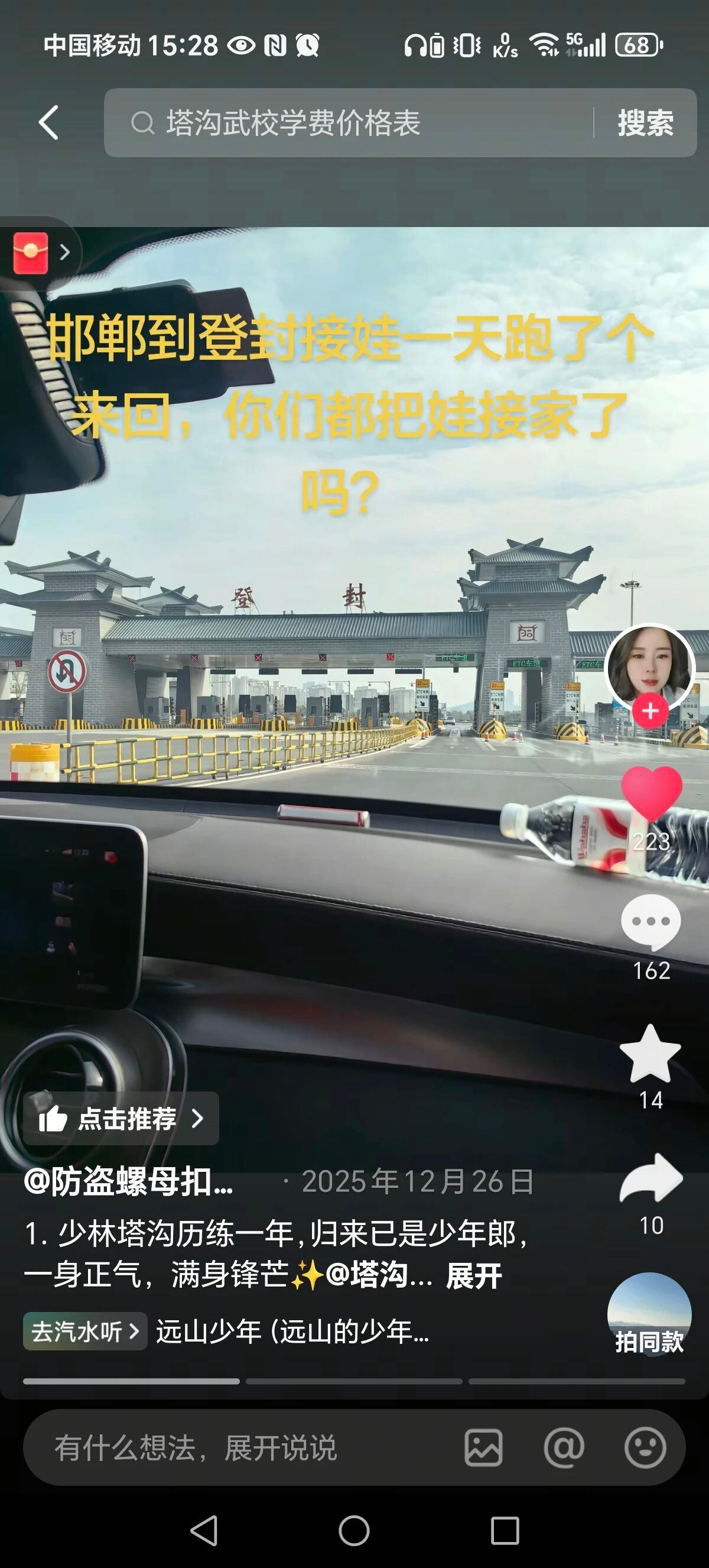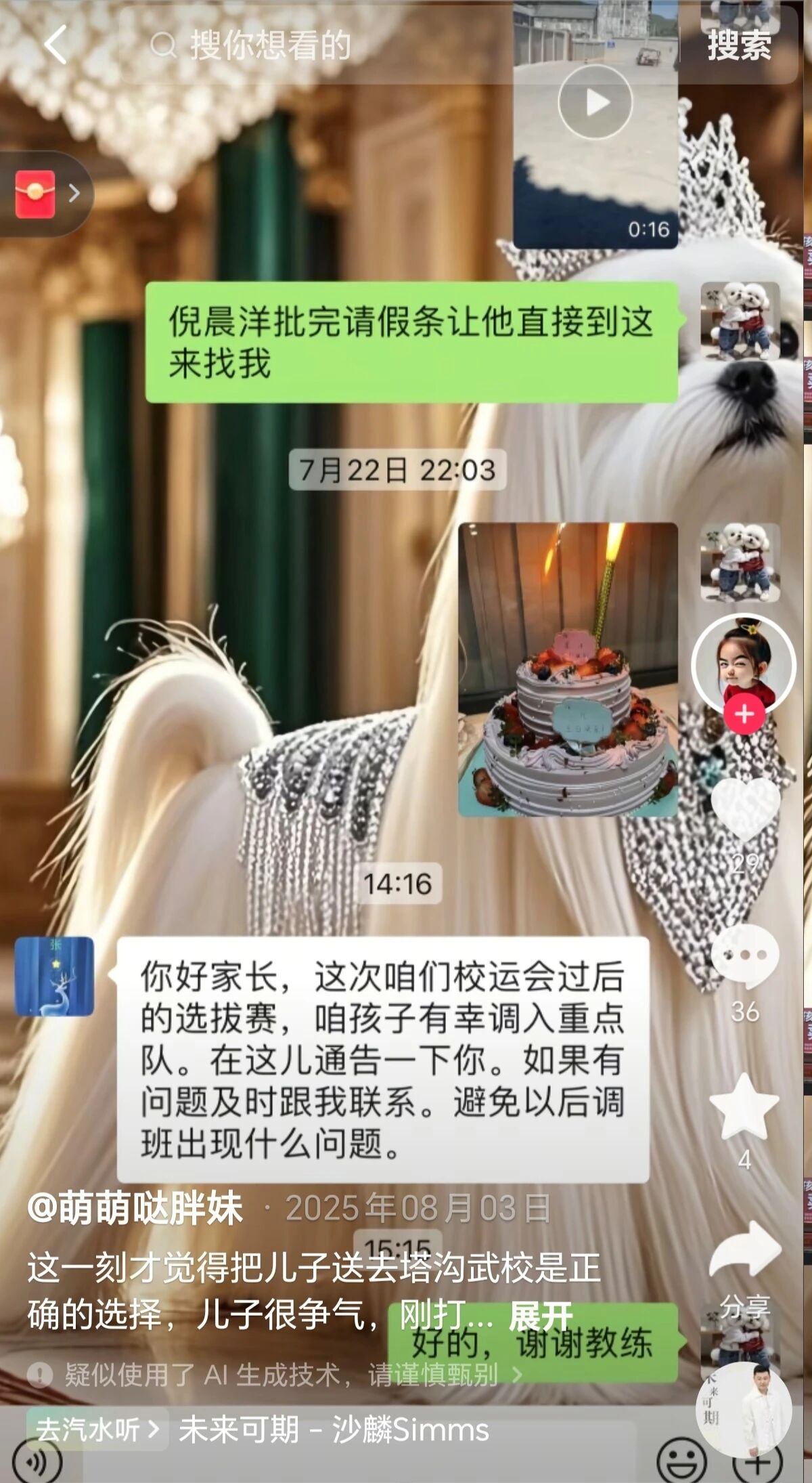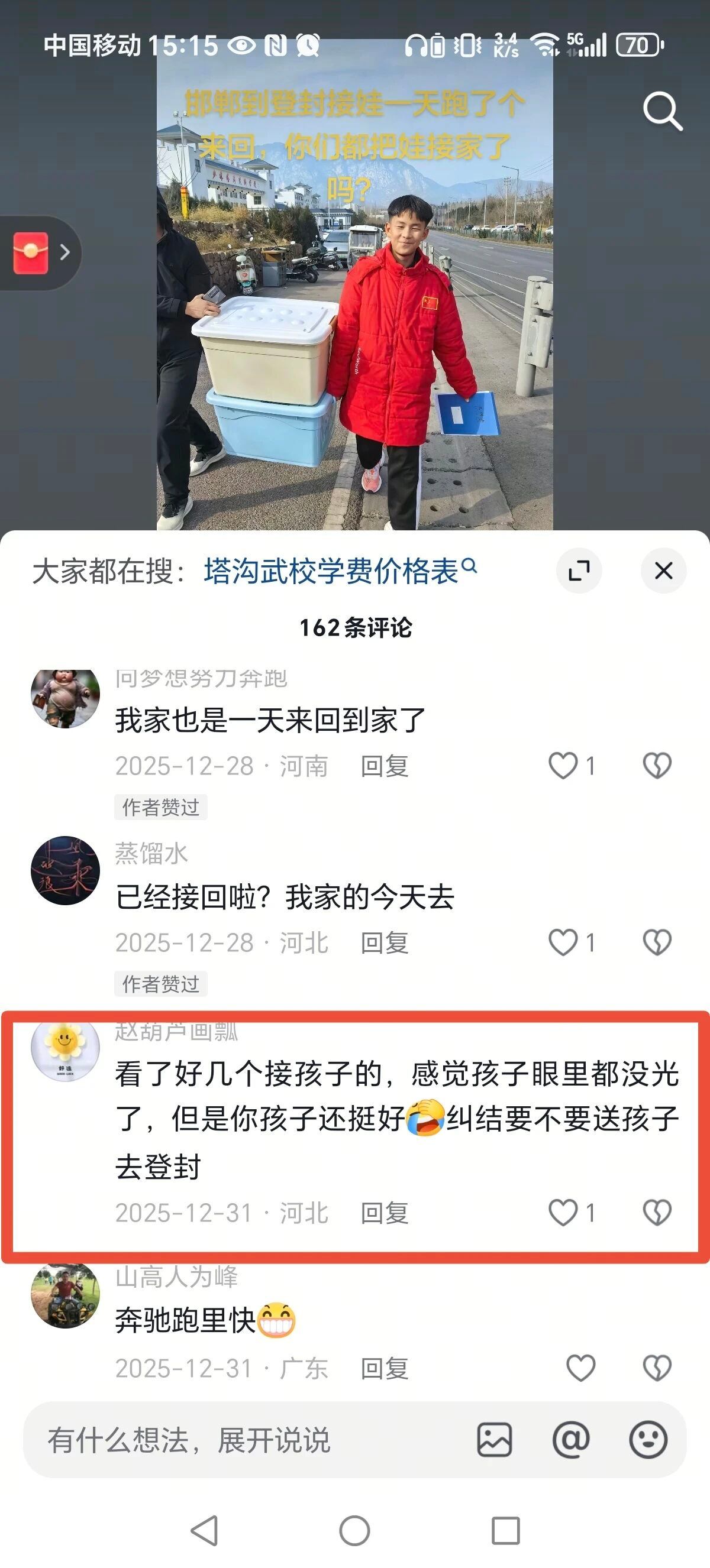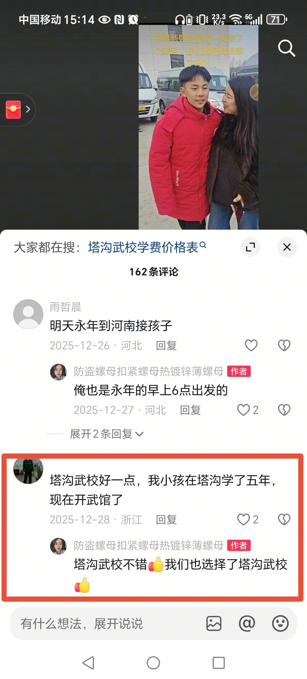 “这一刻才觉得把儿子送去塔沟武校是正确的选择,儿子很争气,刚打完校运会就要进重点培养队了”,抖音昵称为“萌萌哒胖妹”的驻马店网友在抖音里分享孩子的进步,难掩喜悦,即便重点队需要更多的投入,她也毫不犹豫:“老娘愿意为你花,我和你爸爸都努力赚钱支持你,加油!”