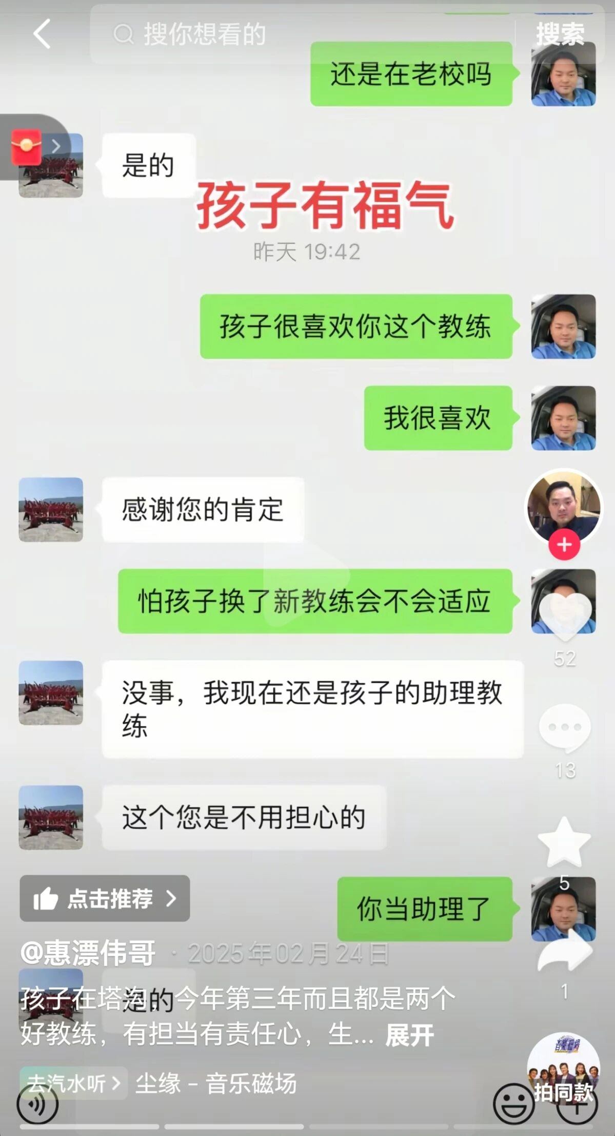 “孩子在塔沟今年第三年,遇到的都是两个好教练,有担当有责任心,生活老师也是一样有责任心,这是孩子的福气,孩子在塔沟学习,我们家长彻底放心”,昵称为“惠漂伟哥”的广东网友在抖音发布的视频,道出了长期陪伴下的真切认可。