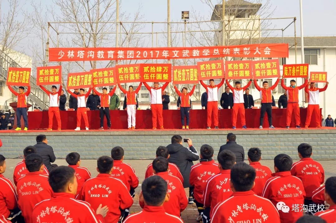 少林塔沟教育集团2017年总结表彰大会隆重举行 12月29日上午,少林塔沟教育集团2017年文武教学工作总结表彰大会在二号练功场隆重举行。集团董事会领导和各教学单位、各处室主要负责人