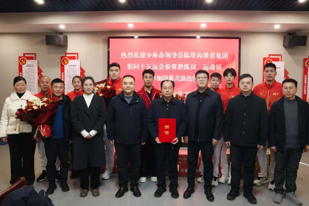 2025年11月27日上午,少林街道党工委书记郝炳鑫,少林街道党工委副书记、办事处主任张笑寒,少林街道党工委委员、办事处副主任吕东东等领导一行专程来到塔沟武校,亲切慰问在第十五届全运会上取得优异成绩的运动员、教练员以及参与演出活动的演职人员。