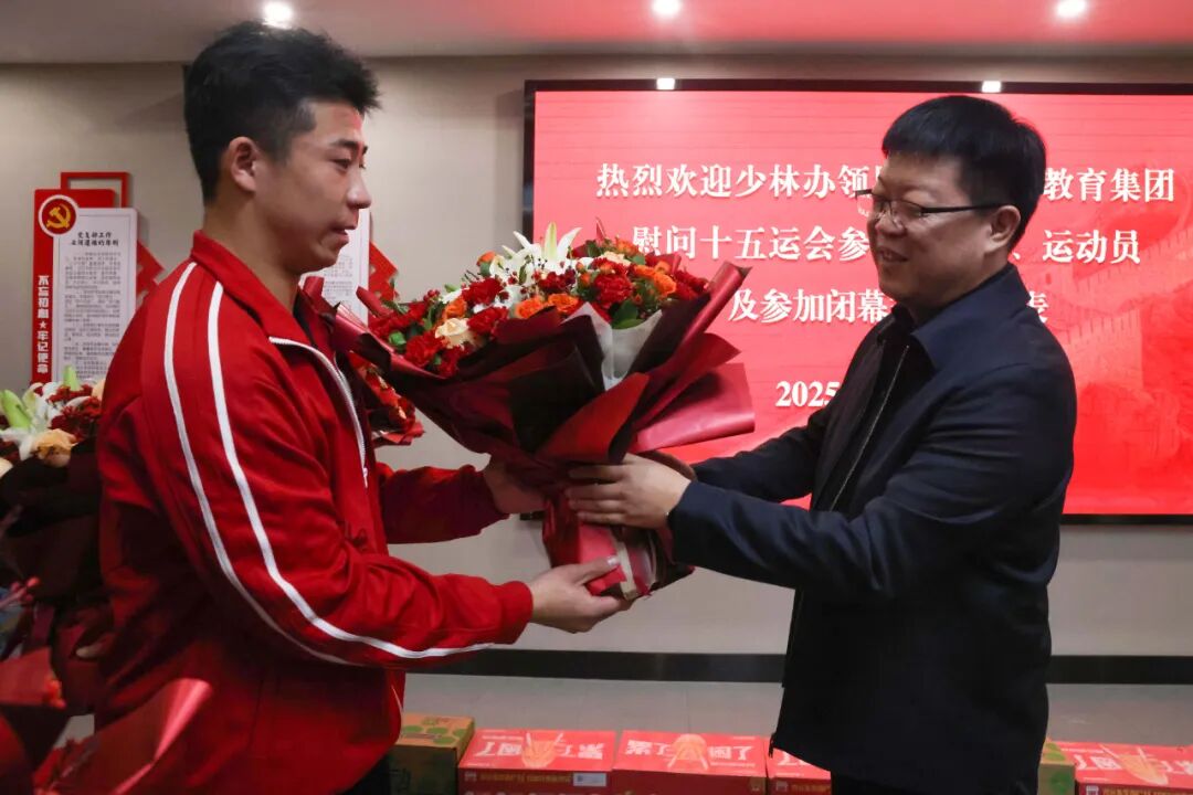 少林街道党工委书记郝炳鑫宣读贺信:“欣闻贵校在第十五届全运会勇夺四金一银,谨致热烈祝贺!这份荣誉,是对贵校长期致力于竞技体育发展与武术文化传承的充分肯定。建校以来,贵校始终坚守“育体育人”初心,在培养奥运冠军等多位优秀运动员、打造体育人才“河南典范”的同时,积极推动少林武术走向世界,多次亮相国际重大活动,为弘扬中华武术文化作出了重要贡献。期待贵校继续探索武术融合发展之路,推动武术教育科学化、标准化,培养更多杰出体育人才,再创佳绩!”